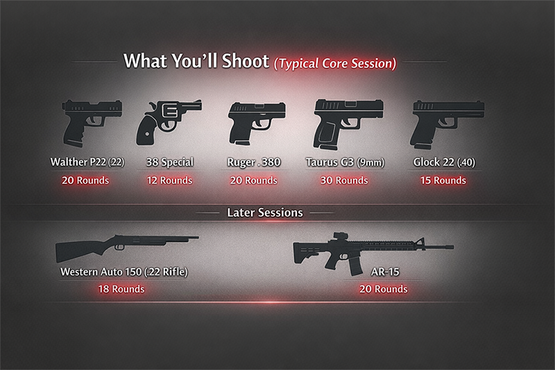 Your shooting progression (built for comfort, not ego). You’ll shoot a curated sequence designed to build confidence step-by-step. We start low recoil, then gradually increase only as you’re ready.